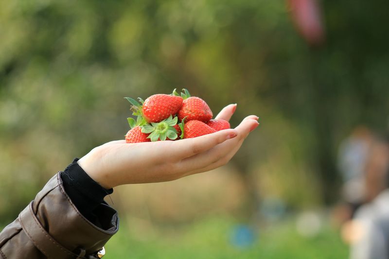 3、摘草莓不要摘太大的、很多大草莓都是空心的。小的草莓红红的最甜了。