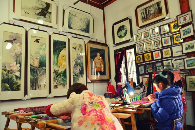 有人觉得这种文化老街都大同小异,其实昙华林也有属于自己的汉味元素。政府在昙华林建立了汉绣基地,汉绣服务社、兰绣轩、红绣坊、媚绣苑四家绣坊落户街上。走进一家家汉绣小店,看那些文静的楚女子们低头汉绣,一张张人物、动物、风景跃然纸上,你能感受到楚文化的传承。绣坊一般不大,墙上挂的是绣好的作品,都可以购买,还有一些学员在学习汉绣,看手法都已经非常专业了。
