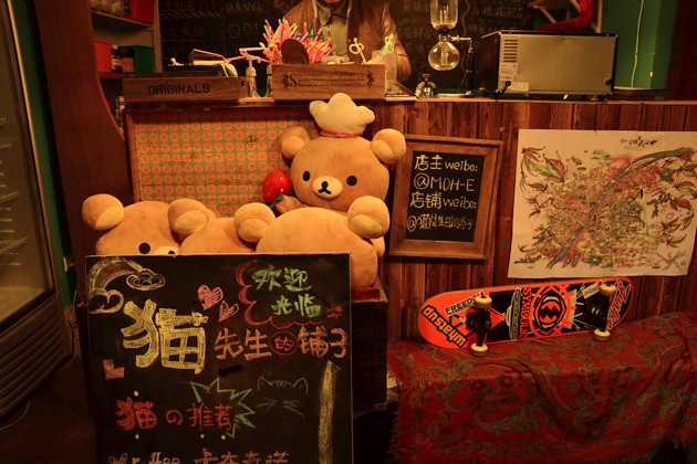 走到昙华林快街尾的地方才发现这家日系小店“猫先生的铺子”,看名字就能知道,这是家喵星人主题的咖啡店。帅哥老板养的几只喵星人平时自由闲散的四处撒欢,或者团成一团找个地方睡觉,心情好的时候也许会去“临幸”一下店里的客人。猫猫的照片、轻松熊、小黄人……整个店风格暖暖的,软软的,还带点宅元素,墙边的架子里有不少手办、模型、复仇者联盟的玩偶,如果是宅男带着女朋友(如果有的话)来就再合适不过了。
