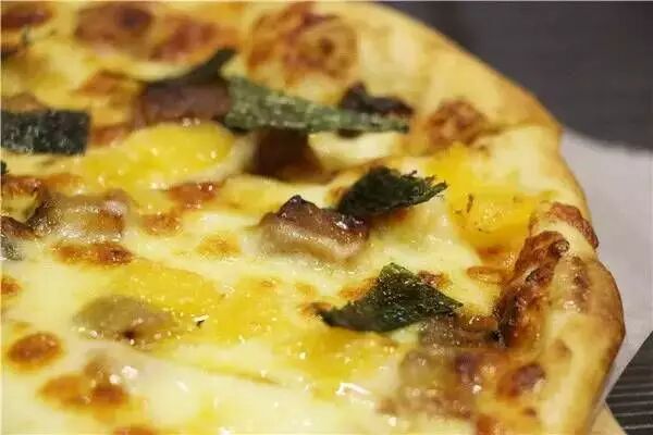 而另一道招牌,金枕榴莲批萨还没端上来就让榴莲控们忍不住了,厚重的榴莲肉在批萨里完全与芝士融为一体,整个批萨吃起来是外酥里嫩,每一口都是满满的芝士榴莲味,对于痴迷于榴莲的人来说这是天大的享受,不过对于不喜欢榴莲的小伙伴来说,这就像地狱。