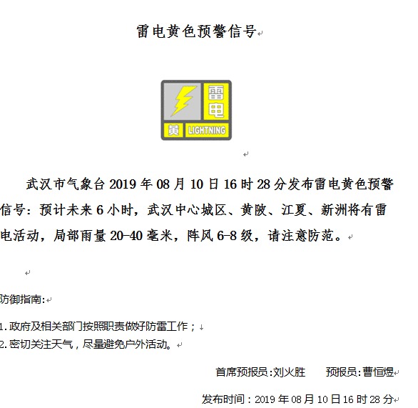 长江日报融媒体8月11日讯 武汉市气象台2019年08月10日16时28分发布雷电黄色预警信号:预计未来6小时,武汉中心城区、黄陂、江夏、新洲将有雷电活动,局部雨量20-40毫米,阵风6-8级,请注意防范。