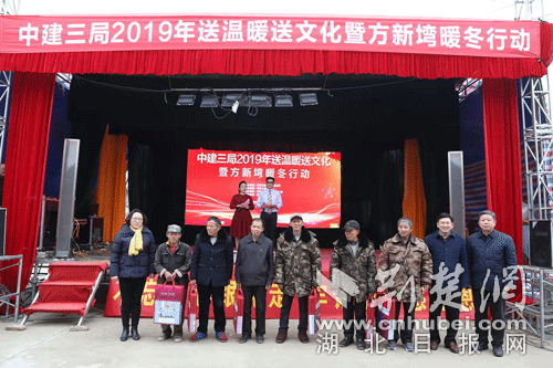 12月24日,中建三局扶贫工作队组织文化演出团队,赴对口扶贫村——湖北黄冈市团风县旦店镇方新塆村,开展主题为“暖冬行动”的精准扶贫文艺下乡巡回演出活动,为对口扶贫的“远亲”们,带来了歌舞、独唱、快板、旗袍秀、湖北大鼓等多种文艺形式和群众喜闻乐见的节目,展现近年来扶贫成果,深受村民群众的欢迎。