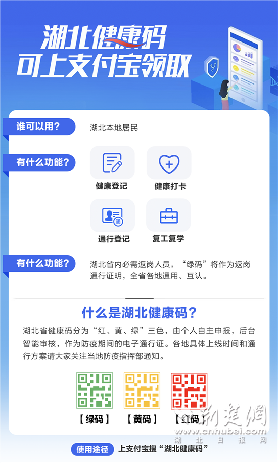 湖北健康码分为绿码、黄码和红码。经比对核验全省防疫数据库中“四类人员”数据,对未查询到的人员,发放绿码;比对核验发现申请人记录为在管的密切接触者,发放黄码;比对核验发现申请人记录为确诊病例、疑似病例、发热病例、无症状感染者,发放红码。对低风险地区人员,申领健康码后4小时内赋码;对中风险地区人员12小时内赋码;对高风险地区人员24小时内赋码。