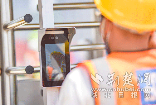 进入工地前,每一位工友都要进行红外线测温。 摄影:李经纬