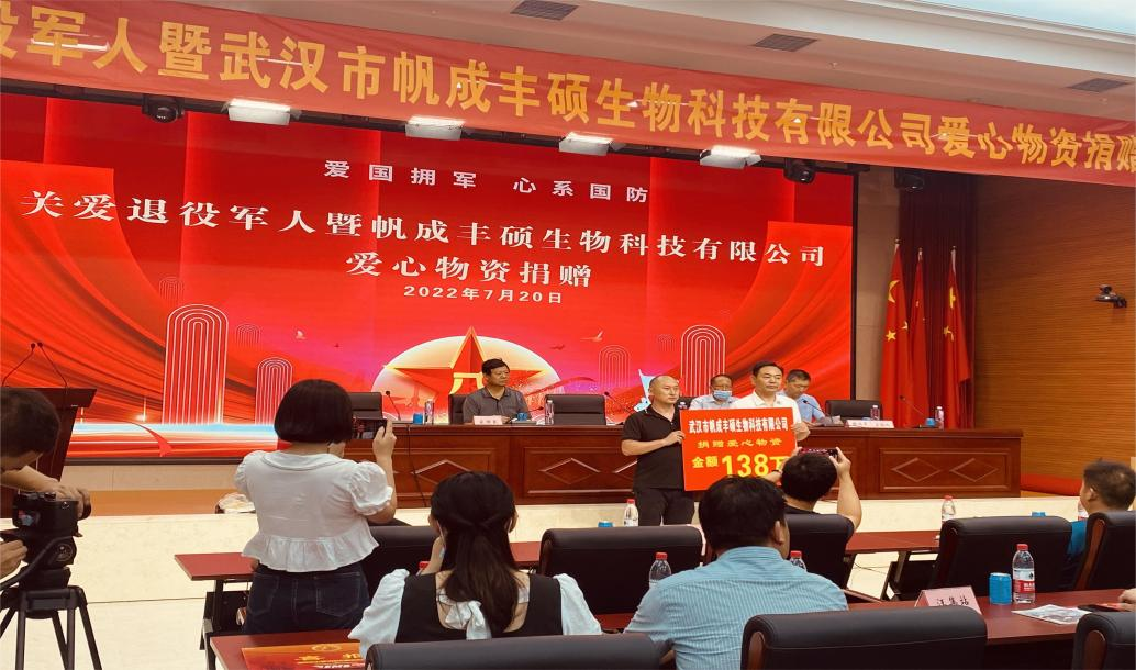 本次活动帆成丰硕生物科技有限公司对新洲区退役军人服务中心、邾城街、阳逻街、仓埠街、李集街、凤凰镇、三店街、潘塘街、徐古街等共捐赠爱心物资138万元。