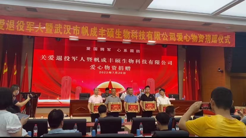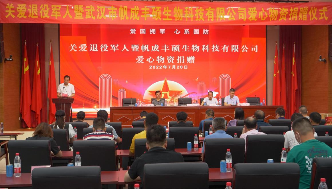 “八一”建军节来临之际,为进一步夯实退役军人服务体系建设,广泛动员社会力量关心、关爱退役军人,努力营造爱国拥军、心系国防浓厚氛围,武汉市新洲区近日在易创智谷产业园隆重举行关爱退役军人暨帆成丰硕生物科技有限公司爱心物资捐赠启动仪式。