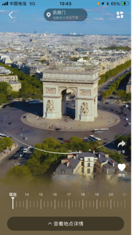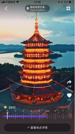 此外,还可以通过手指划动的方式,查看不同角度方案、不同时间段的景点立体模型,部分景点甚至可以呈现夜晚以及不同季节的场景变化,带用户欣赏更为惊艳的光影效果。