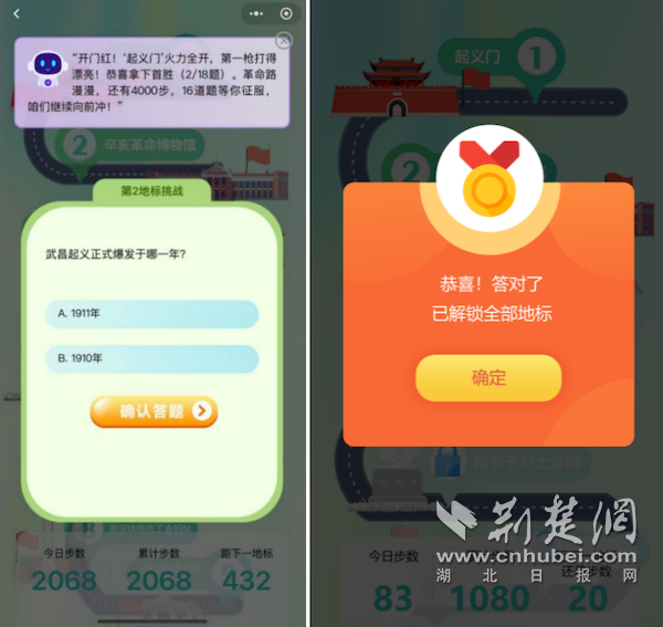 1. 步数自动同步,解锁红色地标:无需手动上传,微信运动步数直接关联!每达到500步,即可点亮一处武汉红色地标(如起义门、辛亥革命博物馆等),累计达到4500步,9大地标将全部解锁,进度可随时在“个人中心-我的进度”查看。