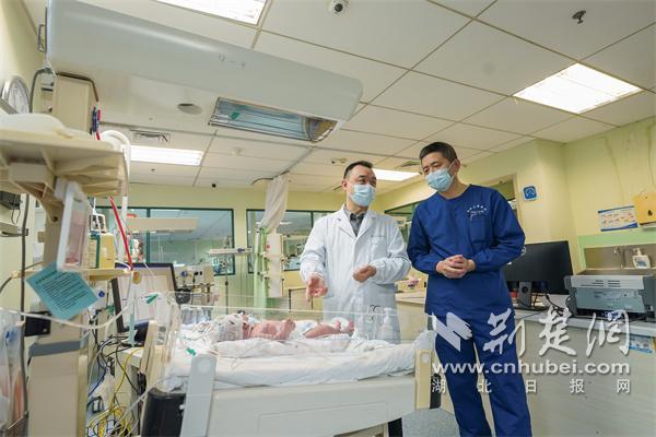 新生儿内科曾凌空主任、新生儿外科鲁巍主任在孩子床边讨论孩子的治疗方案。通讯员供图