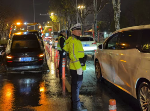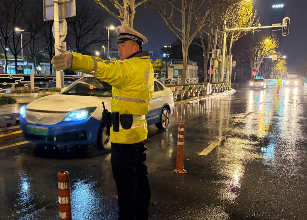 19日晚,在武汉火车站,交警值班保畅。