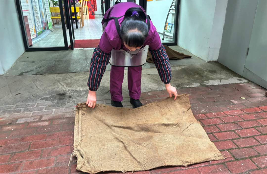 长江康养126社区颐养中心工作人员用防滑垫覆盖道路。通讯员供图