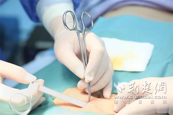 当日11时15分,植入手术在武汉大学人民医院外科门诊手术室准时开始。肝胆外科汪斌副主任医师在为李先生进行了局部皮肤麻醉后,在其肚脐下两指处的皮肤上切开了一个1厘米左右的小口,然后用止血钳在开口两侧的皮下脂肪层熟练分离出一条小“隧道”,使用推药器将纳曲酮植入剂顺利推入“隧道”,并进行缝合。手术全程10分钟顺利完成。