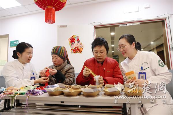 2月11日下午,武汉市中心医院后湖院区肿瘤科五病区的医护人员也为住院患者举办了主题为“小年甜甜,温暖心‘圆’”的病房活动。医护人员为活动现场的患者分发了热气腾腾的汤圆,还一起用金色扭扭棒制作立体福字挂饰。在心声分享和互动游戏中,医患在轻松自然的状态下共度春节前的美好时光。