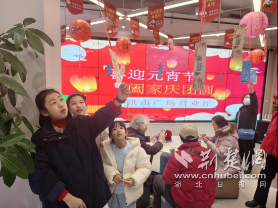 洪山广场营业厅则邀请周边居民开展猜灯谜和手工做灯笼活动。彩灯高挂,灯谜互动热烈,居民在动手制作灯笼的过程中体验传统节俗,节日氛围浓厚。