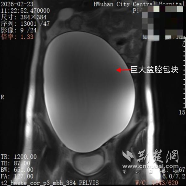 核磁共振下患者巨大盆腔包块的影像图。通讯员供图