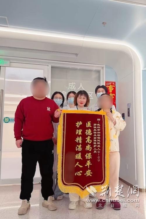 徐女士夫妇给郭俊主任医师团队送上锦旗 。(图源:武汉市妇幼保健院 成人GICU/综合病区)