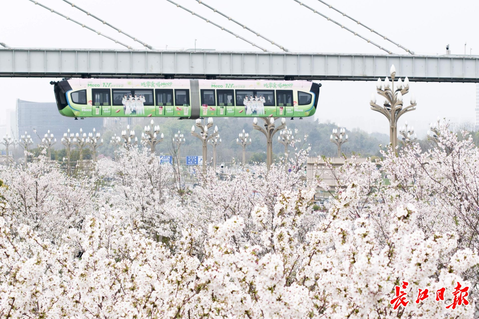 光谷空轨邂逅盛放樱花,赛博赏樱成春日顶流。 记者胡冬冬 摄