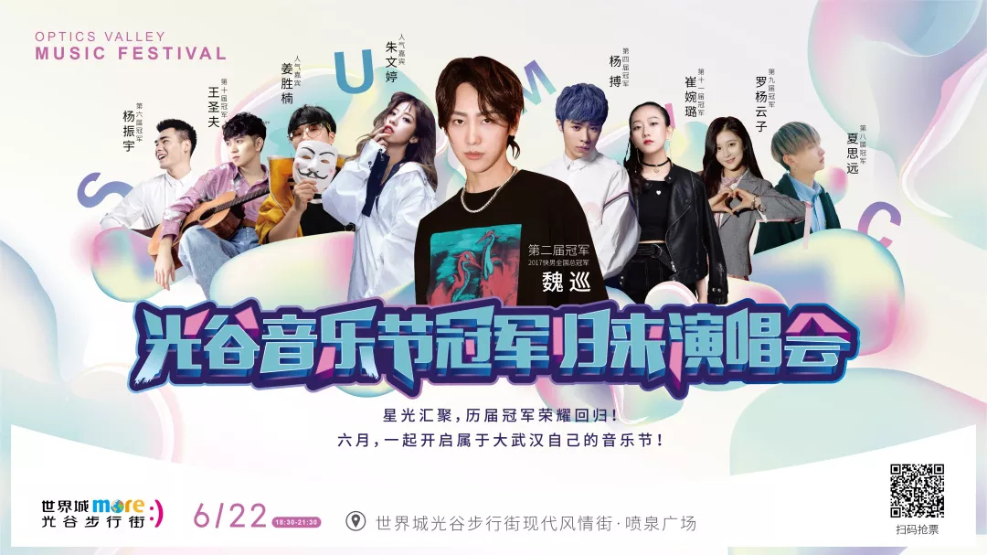 6月22日,第12届光谷音乐节之“冠军归来”演唱会于光谷步行街喷泉广场上演,第二届光谷音乐节冠军、2017快乐男声全国总冠军魏巡,携手历年7大光谷音乐节年度冠军重返舞台,点燃盛夏激情!