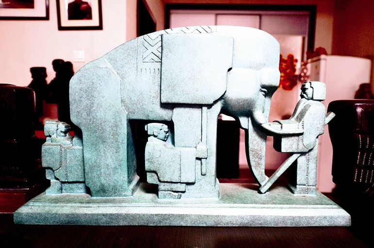 三个老人,分别站在大象身前、腿边与尾部,试探地抚摸,大象则温顺地垂下鼻子。人人都看得出这是“盲人摸象”的中国传统故事,但这件巨大的石雕作品却造型古朴、线条抽象,更有西方现代艺术的味道。