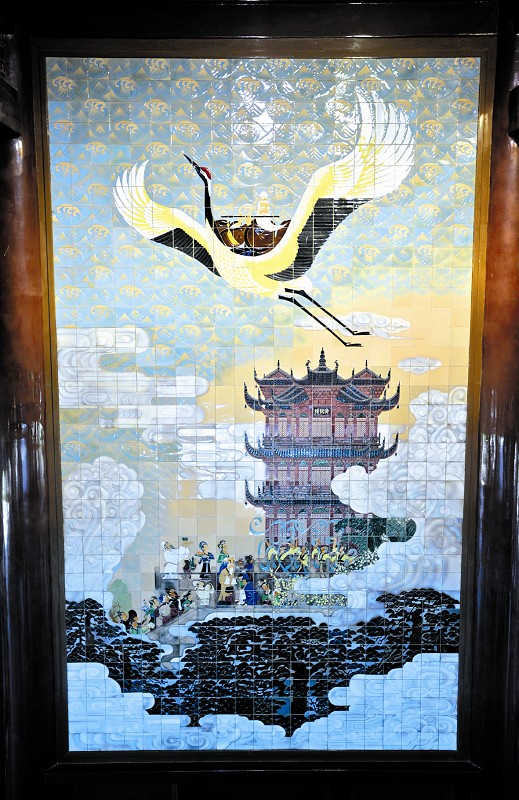 在黄鹤楼一楼大厅里,有这样一幅巨型壁画,游客进来必驻足细看。这是“橘皮画鹤”,亦名“辛氏酒家”,是关于黄鹤楼起源的一个故事。类似的故事有数十个,流传千年后,形成了一个独特的黄鹤楼传说系列,并在2010年被列入国家级非物质文化遗产名录。弃恶扬善、戒贪寡欲,是黄鹤楼传说的核心价值和现实意义所在。