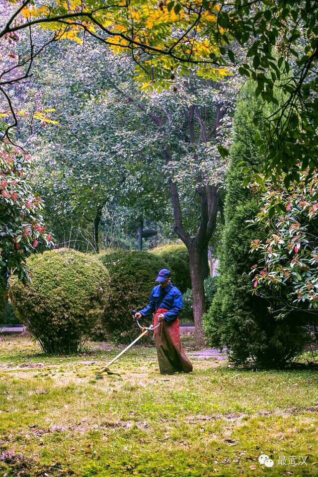解放公园里的除草师傅,蓝色解放衣配大红围腰,时尚就是这个味!