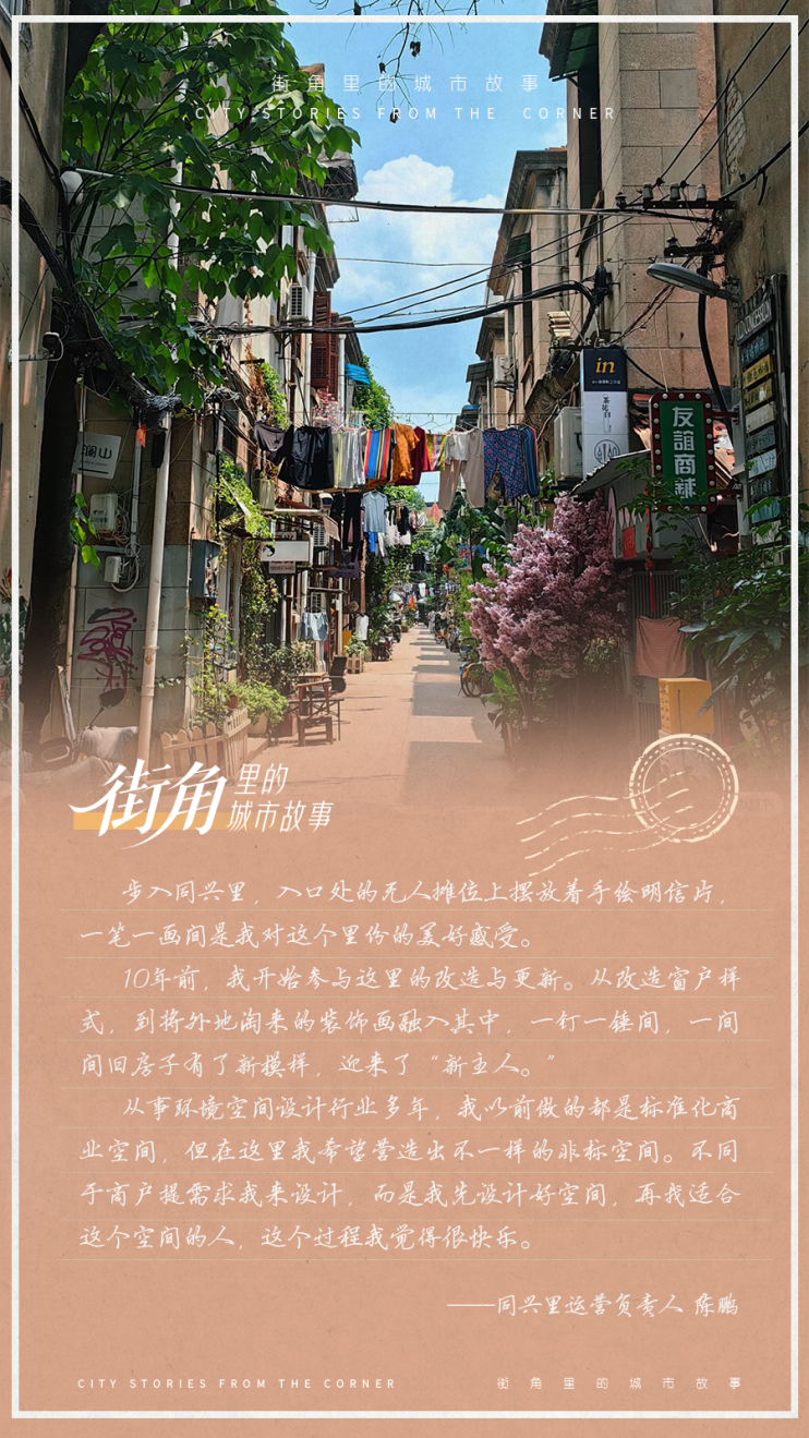 2013年,曾在高楼大厦从事装饰事业的陈鹏,因一直向往有巷子、鸟语花香的地方,便在同兴里租下30多间老房子,在保留历史建筑原有风貌的基础上进行创意改造。“老房子有其独特的气质,适合营造非标的商业空间。利用专业知识让这里变得更好,留住城市肌理,是我的情怀。”