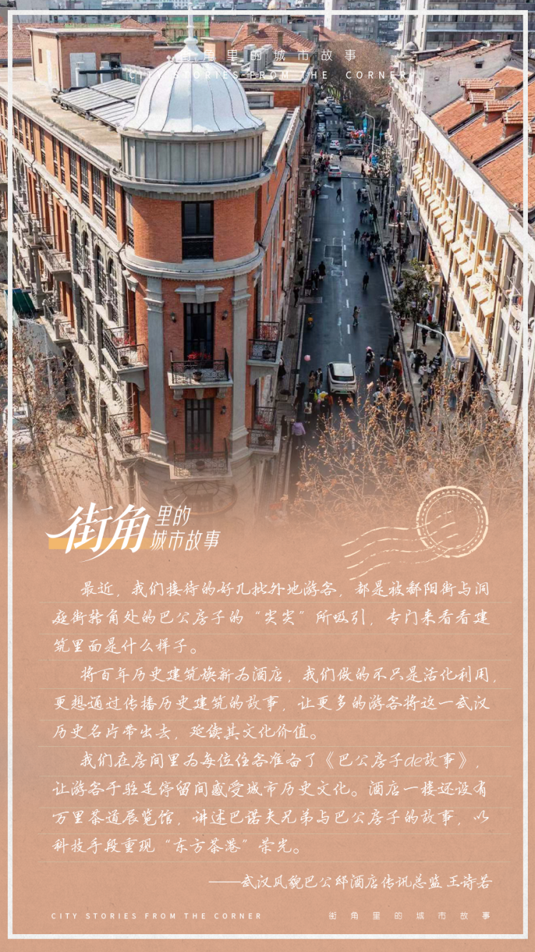 酒店管家讲好城市故事。2024年,经过精心修缮,百年巴公房子归来,焕新为武汉风貌巴公邸酒店。酒店配套有万里茶道展览馆,以科技手段讲述巴诺夫兄弟与巴公房子的万里茶道故事,“让游客能亲身居住进这幢百年洋房中,重温万里茶道的繁荣盛景和东方茶港的荣光。”武汉风貌巴公邸酒店总经理许丹说。