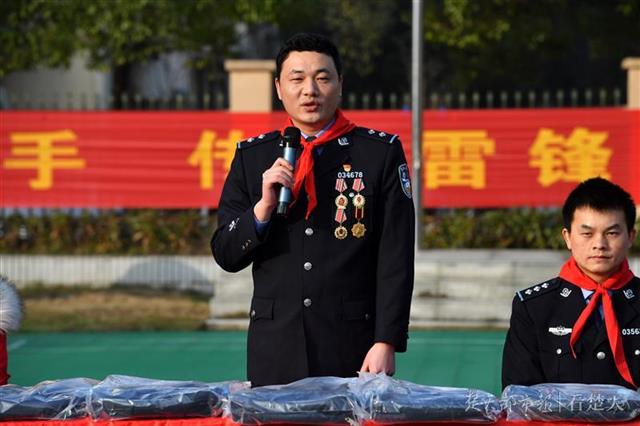 楚天都市报3月4日讯(记者叶文波 邹斌 通讯员李立铭 罗维舟 实习生焦孟雷 别明蔚)学雷锋,在行动。3月4日上午,江城警界“闪电侠”、“武汉警星”黄鸿杰来到洪山区武大附校托管金鹤园学校,在国旗下深情讲话,向近千名“流动花朵”讲述个人经历,鼓励他们成长为对社会有意义、有贡献的追梦人。