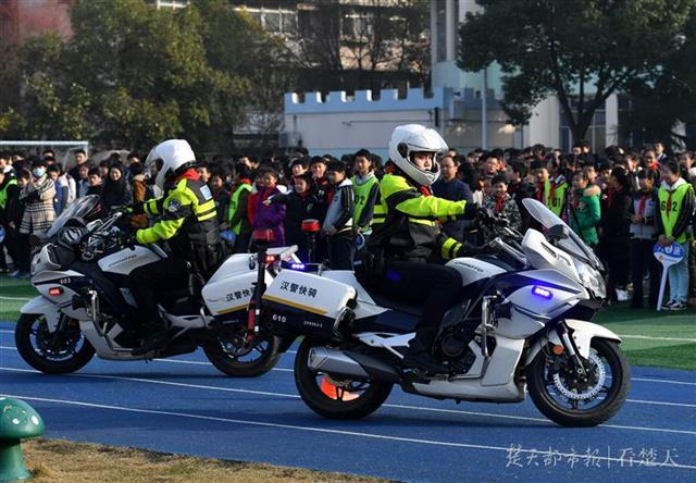 接着,洪山区交通大队四名“汉警快骑”队员身着醒目制服,跃上警用摩托车,在操场上进行了队列表演,队员们变换各种队形,时而呈方阵,时而呈扇形,引来阵阵赞叹。