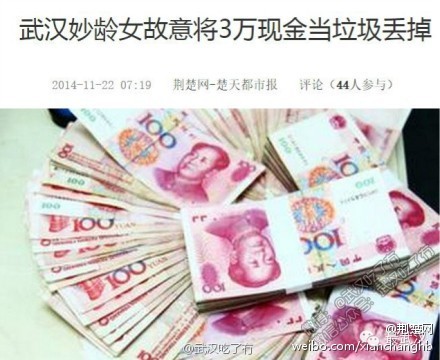 有钱,任性!武汉一女子在武汉硚口一家超市购物后,将一个蓝色塑料袋丢进超市的垃圾桶里。“你丢的什么?”店主问。“垃圾!”店主走近一看,袋里竟是人民币,连忙报警。经调查,“垃圾”是3万多元的现金,该女子与丈夫闹矛盾,赌气做出丢钱之举。