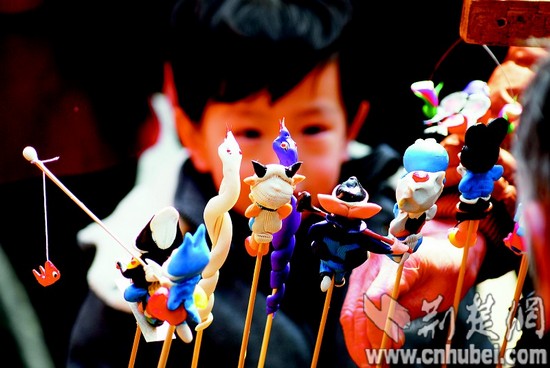 图为:长春观庙会上,精美的面人吸引着孩子们的目光。
