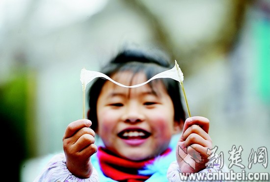 图为:武汉天地新春庙会上,一名小女孩在欢快地搅糖。