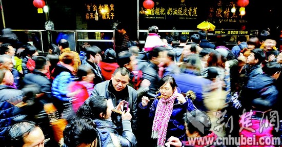 图为:13日中午,户部巷小吃一条街人海如潮,南来北往的人们前往这里品尝各种武汉特色小吃。