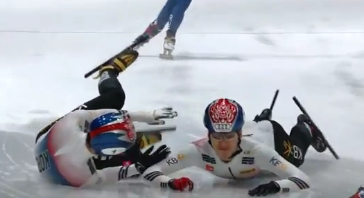 比赛开始阶段,中国处于领先位置。高潮出现在后十圈,中国和韩国在交接时韩国队阻挡中国,四人发生碰撞,结果两队全部失去领先优势,俄罗斯和日本队领先。