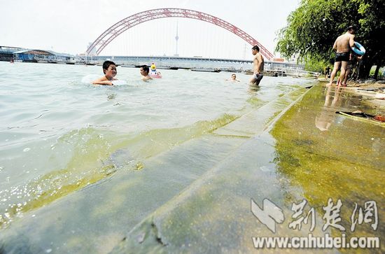 图为:长江龙王庙段,市民在这里欢快戏水消暑,全然没有洪峰当前的紧张。